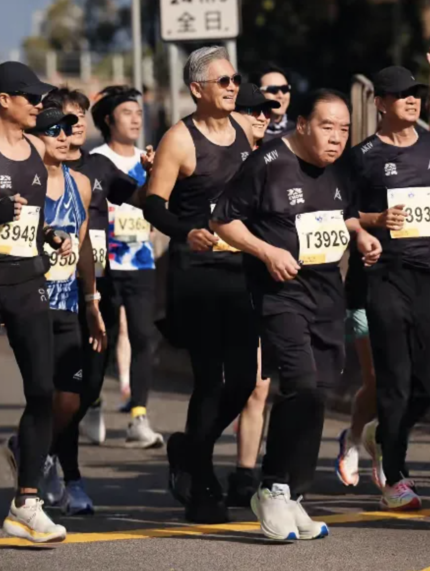 周润发四战港马,今年他重回10公里,陪着好朋友们完赛。
